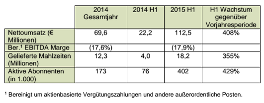 Trotz des starken Wachstumspfads konnte HelloFresh sowohl in 2014 als auch im ersten Halbjahr 2015 ein positives bereinigtes EBITDA (vor Marketingkosten), mit einer bereinigten EBITDA-Marge (vor Marketingkosten) von entsprechend rund 13,4% bzw. 15,7%, erzielen.“