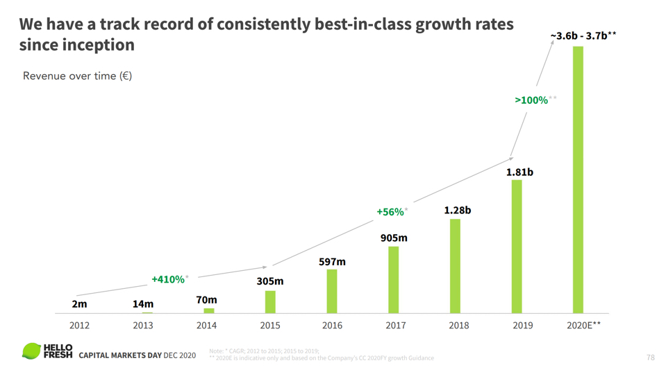 HelloFresh hat die Prognose für 2020 zum fünften Mal angehoben und auf dem Kapitalmarkttag gestern erläutert, mit welchen strategischen Initiativen es in den kommenden 5 bis 7 Jahren von 3,6 Mrd. Euro auf 10 Mrd. Euro wachsen will (PDF-Quelle):