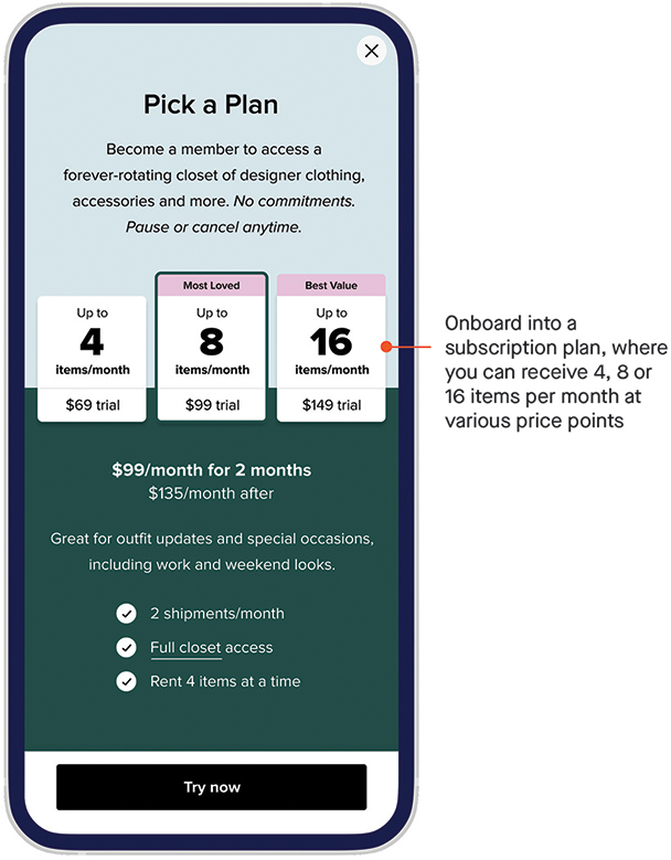Generell bietet Rent the Runway seinen „Mitgliedern“ unterschiedliche „Pläne“, abhängig davon, wieviele Kleidungsstücke sie wie lange behalten wollen: