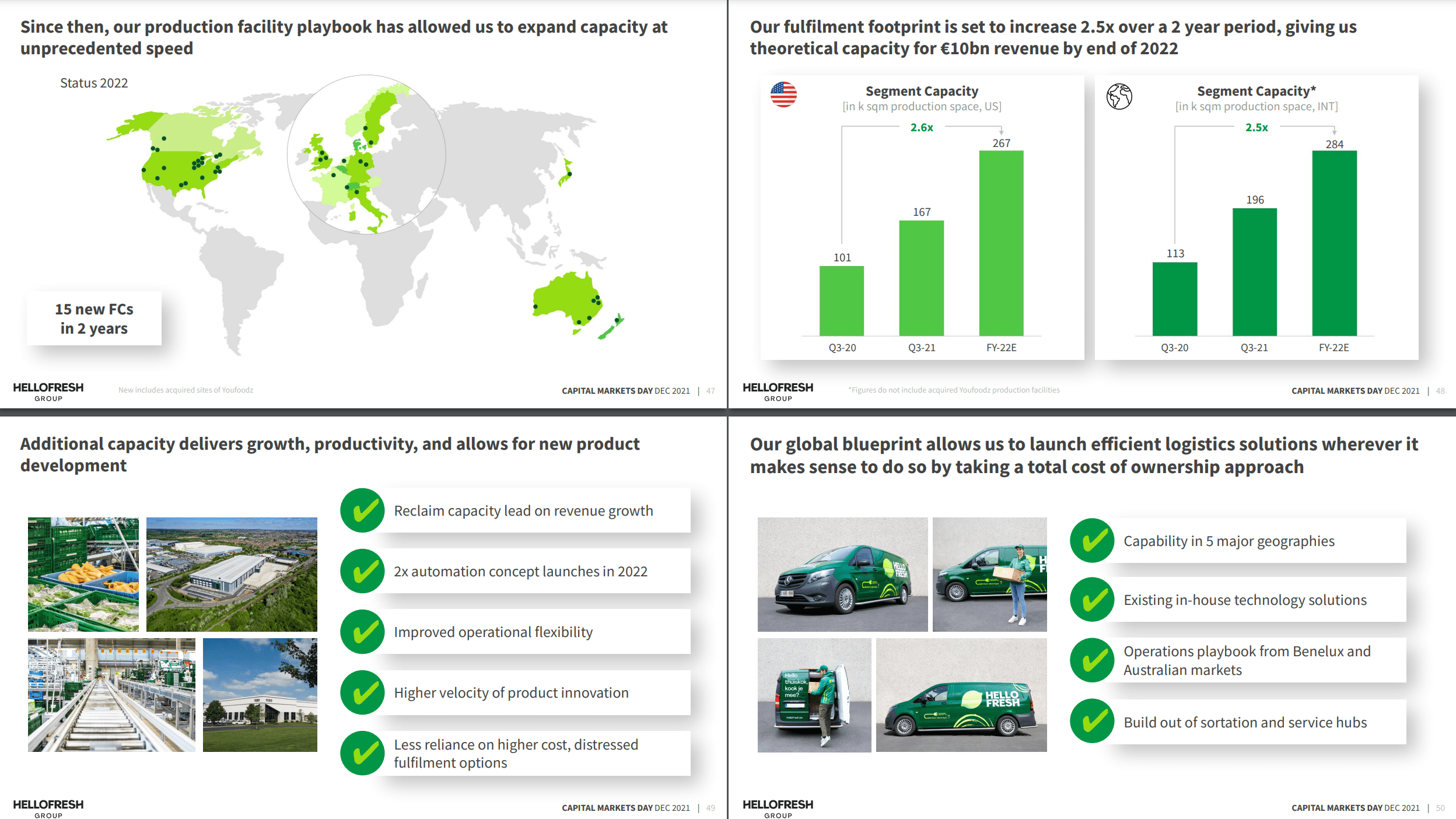 Auch das Umsatzziel von 10 Mrd. Euro belässt HelloFresh erstmal bei 2025, rüstet aber seine Produktionskapazitäten schon so, dass es das Ziel bereits 2023 erreichen könnte (PDF-Quelle):